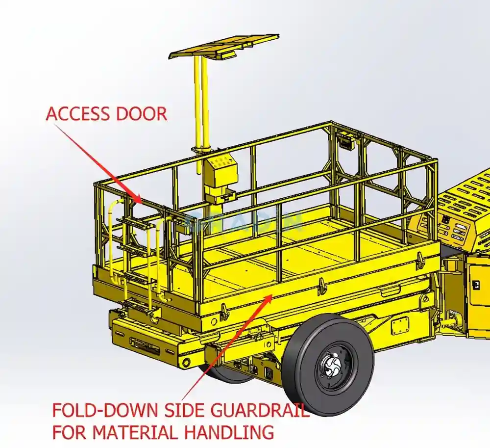 Unlike conventional fixed or mobile lifts, this platform mounts directly to the mining vehicle chassis, traveling to operational sites with the vehicle. The base frame connects to the vehicle frame using dedicated mounting dimensions, ensuring structural stability during vehicle movement and operation.
