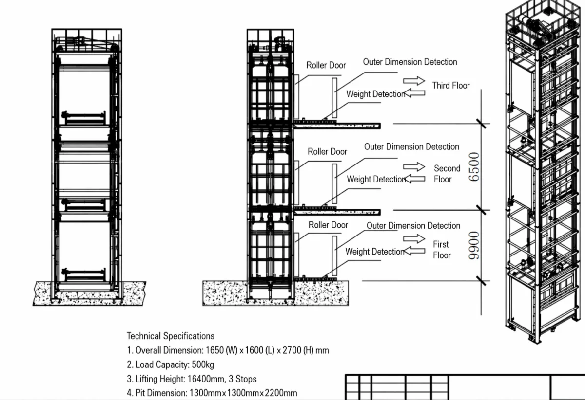 - Compact layout: Car W1600×L1600×H2700mm, T90 rails, 16A chain, RAL7035 finish.