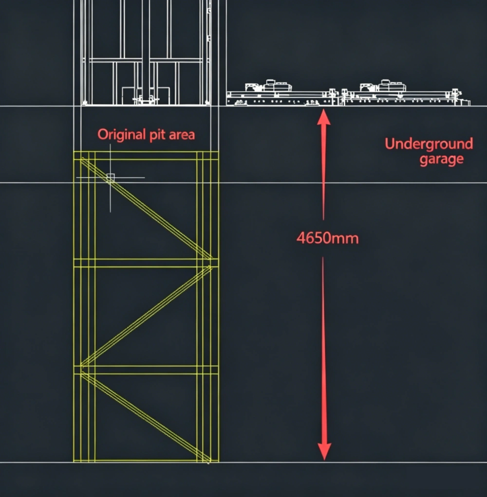 | Structure type | Pit-less through-floor (basement garage installation, columns extended 4650mm downward) |