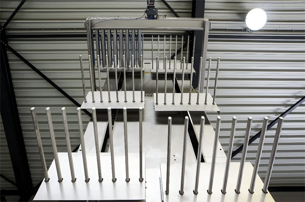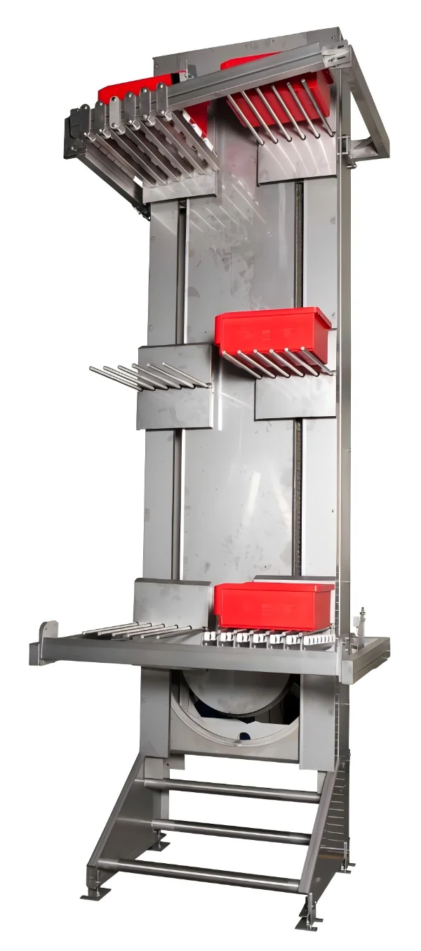 The equipment features a unique fork-arm cyclic design that enables efficient and smooth vertical transportation of products between different floors without interrupting the production process, while ensuring products remain upright throughout handling to effectively maintain product integrity and cleanliness.